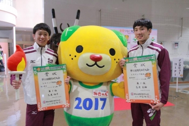 兄弟そろって圧倒的な優勝を飾った乙黒拓斗(左)と圭祐。マスコットのみきゃんと笑顔で収まった
