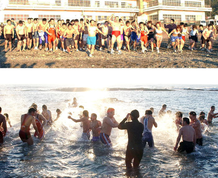 2004年元旦の寒中水泳(茨城・大洗海岸)。赤パンツのアニマル浜口さん(上写真中央)の号令のもと、海へ飛び込んだ
