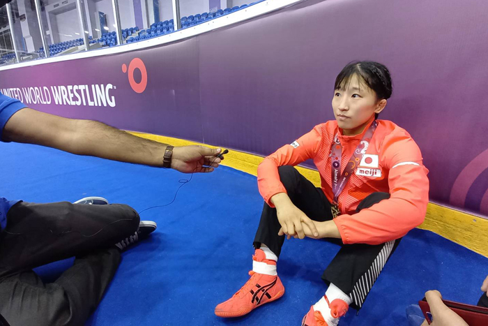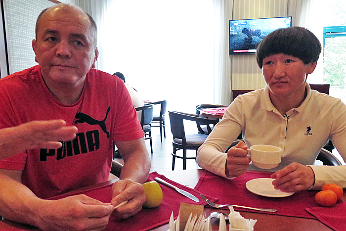 そのとき、マスクもせず会話する者がなんと多かったことか。ドクターからも「ビュッフェやサウナでは注意するように」というお達しがあった。昼食時を見計らい、川井友香子選手の最大のライバルとなるキルギスのアイスルー・チベニコワ選手とノルベ・イサベコフ女子ヘッドコーチの話を聞く。ふたりとも、快く取材に応じてくれた。感謝。