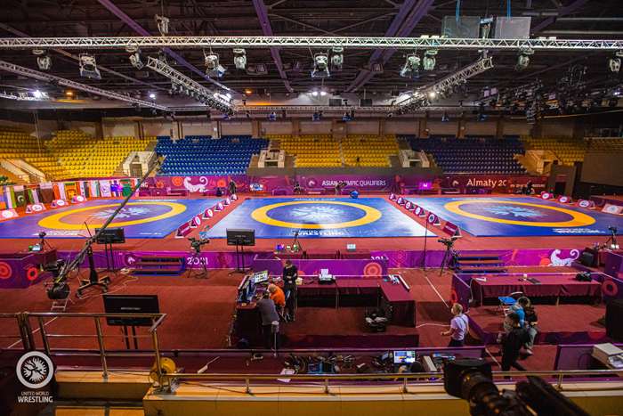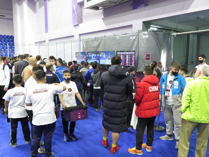 アジア予選初日。この日は男子グレコローマン。試合は11時から開始され、まず準決勝まで。休憩のあと、午後6時から決勝と3位決定戦が行なわれるスケジュールだった。