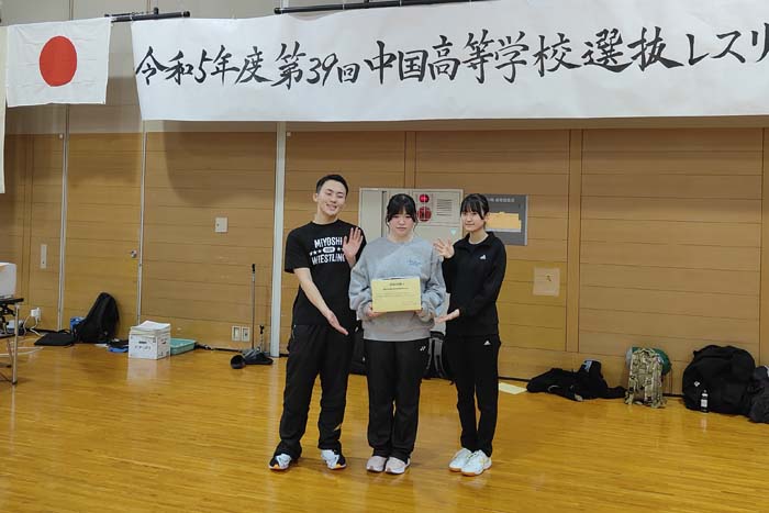 ▲募金活動に尽力した(左から)広島・三次高の高田大和、佐々木里菜、広島・賀茂高の三木詩織の各マネジャー=提供・中国高体連レスリング専門部