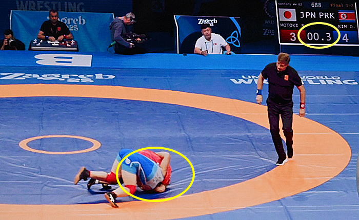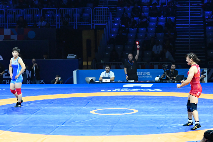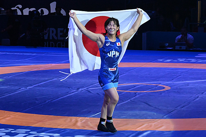 昨年のパリ・オリンピックに続く世界一を目指す元木は、アジア選手権2位のキム・オクユ(北朝鮮)が相手。キムの粘りに遭って終了24秒前に3-4とリードを許した。逆転を狙って終了直前にかけた首投げは0ポイントと判定されたが、チャレンジによるビデオチェックの結果、相手の肩がラスト0.3秒の段階で返っており、2点が入って5-4へ。薄氷を踏む思いで初の世界選手権優勝を果たした。
