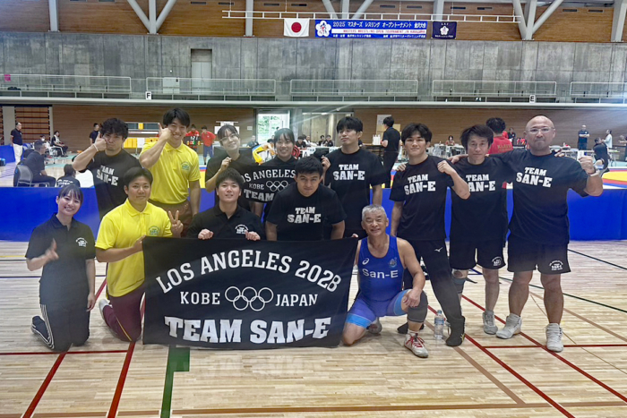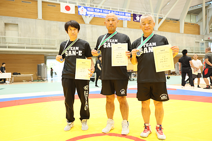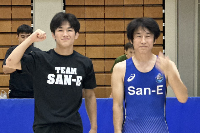 9月23日に石川・金沢市で行われた「2025マスターズレスリング・オープントーナメント金沢大会」には、三恵海運の鈴木貫太郎コーチが、監督を務める帝塚山大の佐藤将章コーチ、沼田義次コーチ(沼田将吾主将の父)の2選手とともに出場。鈴木コーチと佐藤コーチが優勝、沼田コーチはセコンドについた将吾主将からの熱い声援で健闘したが無念の銀メダル。しかし、“TEAM San-E”の3人がそろってメダルを手にした。