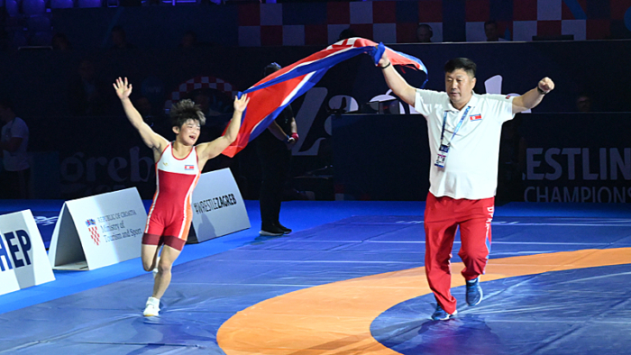 ▲2階級を制し、国別対抗得点で2位に浮上した北朝鮮(写真は50kg級優勝のウォン・ミョンギョン)