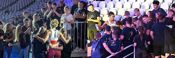 第2セッションでは、女子のファイナルが行われ、68kg級で3位決定戦に勝ったケネディ・ブレーズ(これまで「ブレーデス」と表記してきましたが、保高カメラマンが「ブレーズ」と発音する旨をゲットしたので、そう表記します)が、3位決定戦の試合が終わると、フロア出口でファンからの記念撮影攻めに遭いました。
