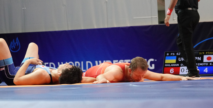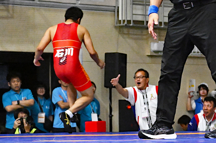 2日前に終わった国民スポーツ大会(滋賀・栗東市)で、教え子(松本倖希=男子グレコローマン92kg級)を優勝させ、息つくひまもなく出発するDivisionE(56~60歳)70kg級の山下勝(石川・志賀高教)は、全日本マスターズ選手権には今年1月に10回出場を果たしたが、この大会には初出場。以前から出たい大会だったものの、国体(現国民スポーツ大会)と重なることが多く、日程がわずかにずれた今年、やっと参加が実現したと言う。