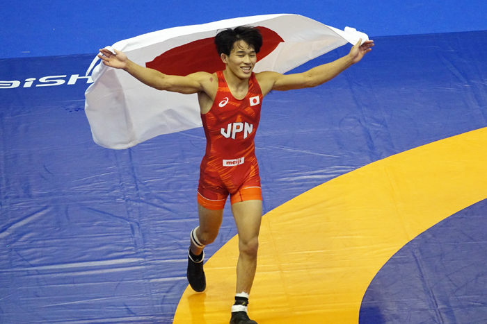 ■男子グレコローマン60㎏級優勝・五味虹登(育英大=全試合テクニカルスペリオリティ勝ちで優勝)「プレッシャーをかけ、自分から攻めるレスリングを徹底し、そこがうまくできた。決勝戦での最後はちょっとヤバいかな?(技がかからないかな?)と思ったけど、しっかりと一本背負いで投げることができてよかった。