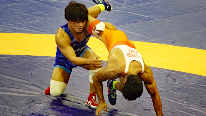 ■男子フリースタイル74㎏級3位・青柳善の輔(クリナップ=3位決定戦でインドのパルビンダーを8-2で撃破)「(前日の試合で痛めた)指は使わないようにしていて、自分ができる技を出した感じでした。(気持ちの切り替えは?) 特に考えてなかったので大丈夫です。いつも、あまり気にせず次に次にという感じなので。メダルを取れたので、12月の天皇杯(全日本選手権)に向けて、少しずつよくなっていければな、と思います。