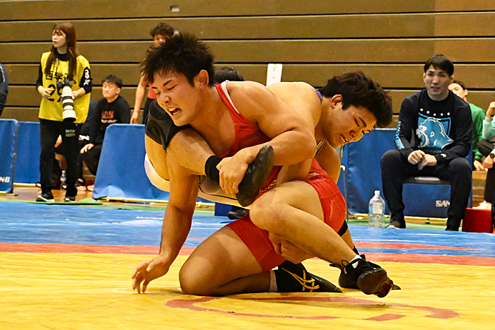 フリースタイルへの挑戦となった97kg級の吉田泰造(日体大)は4試合を勝ち抜いて決勝へ進出。世界3位の吉田アラシ(日大)との“吉田対決”に挑む。吉田アラシは2階級にまたがっての4連覇がかかる。
