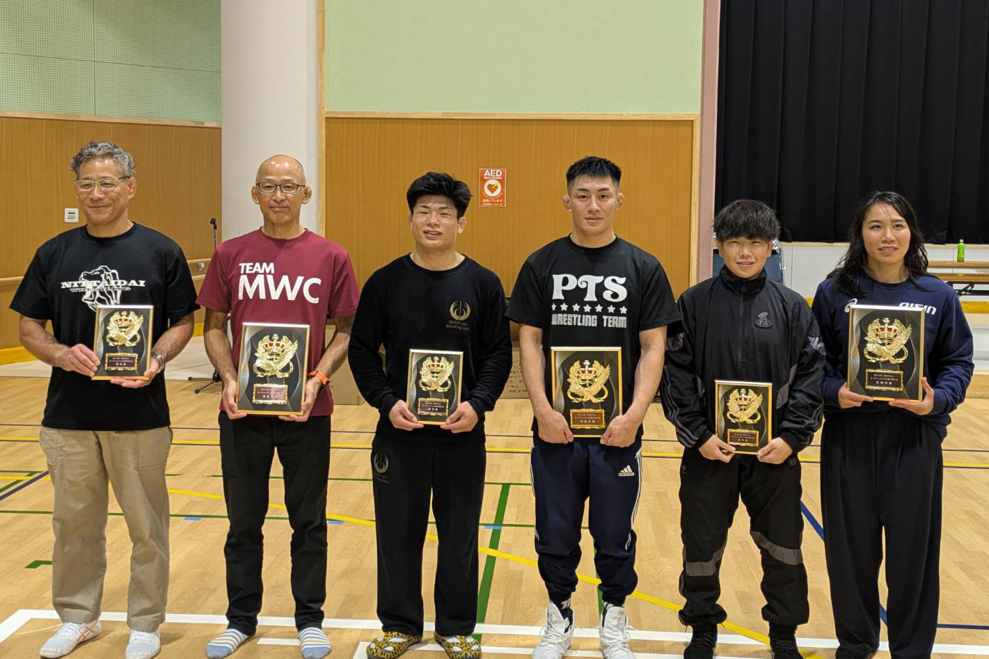 (左から、ベテランズ優秀選手賞・有賀浩樹(岐阜工クラブ=B 78㎏級)、ベテランズ最優秀選手賞・小林洋祐(松阪クラブ=B62㎏級)、男子グレコローマン優秀選手賞・竹下航生(警視庁=63㎏級 )、男子グレコローマン最優秀選手賞・河名真偉斗(自衛隊=67㎏級)、女子優秀選手賞・岡田純奈(自衛隊=59㎏級)、女子優秀選手賞・源平彩南(アイシン=62㎏級)