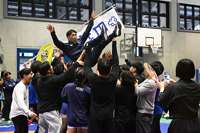 ▲監督就任1年目でチームを優勝に導き、胴上げを受ける日体大・田南部力監督