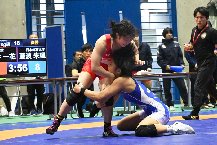 参加が6チームになったことで、初めて2ブロック制で行われた今大会。A組は4連覇を目指す育英大、B組は王座奪還を目指す日体大が勝ち上がって決勝で対戦し、育英大が50kg級から2連勝して優位に立ったが、日体大がU23世界選手権優勝の藤波朱理とシニア世界選手権優勝の尾西桜が返して2勝2敗へ。