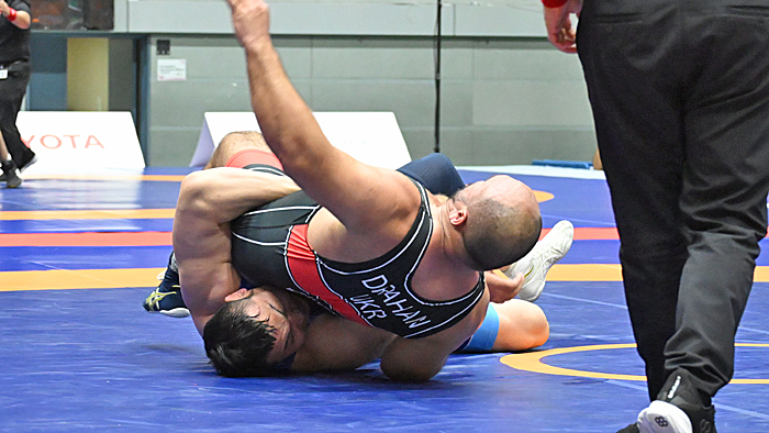 序盤に1点を先制されたものの、粘り強く攻めてテークダウンを取り、パシビティを与えてからのローリングでポイントを取って引き離した展開は、まさに思っていた通りの試合展開。全日本チームでもらつ腕を振るっている鶴巻宰コーチ(自衛隊)と湯元健一コーチ(大体大職)に感謝した。