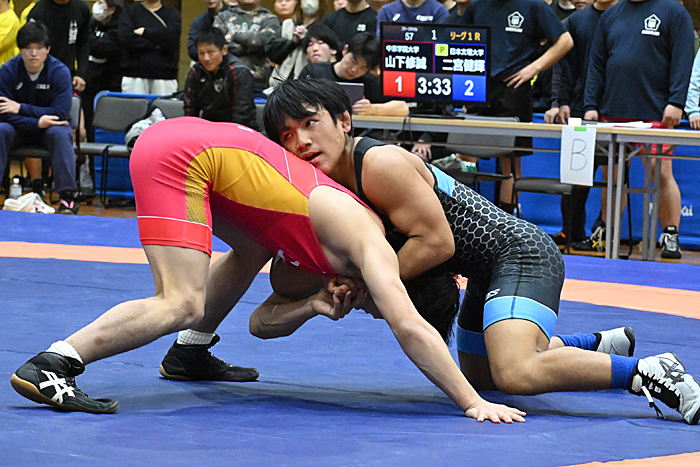 二宮健輝(青=日本文理大)○[9-3]●山下修誠(中京学院大)