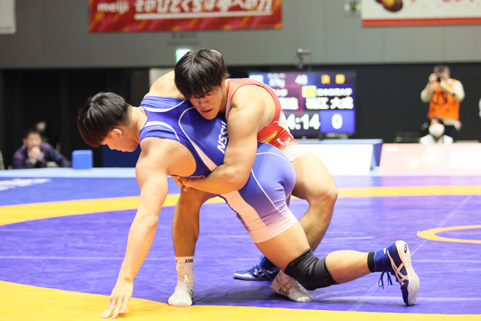 同97kg級は世界選手権代表の仲里優力(松尾建設)と国民スポーツ大会優勝の鶴田峻大(自衛隊)の対決となり、鶴田が勝って2021年以来、4年ぶりの優勝を達成した。