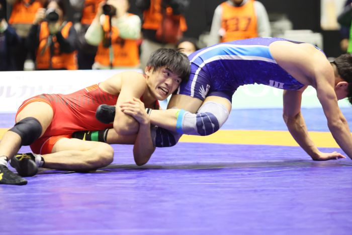 4点ビハインドからの大逆転! 2025年天皇杯全日本選手権・第2日(12月19日)に行われた男子フリースタイル61kgp級決勝は、長谷川敏裕(三恵海運)向田旭登(専大)を14-4のテクニカルスペリオリティで撃破。2021年に57kg級で優勝して以来、4年ぶりに天皇杯を制した。