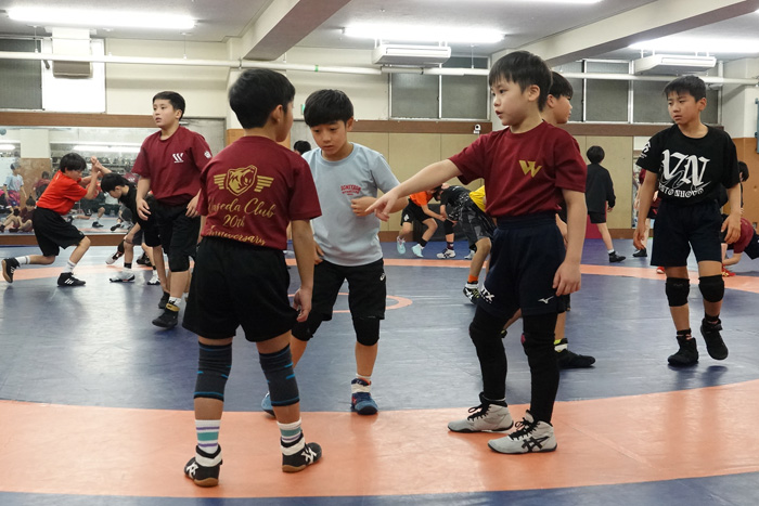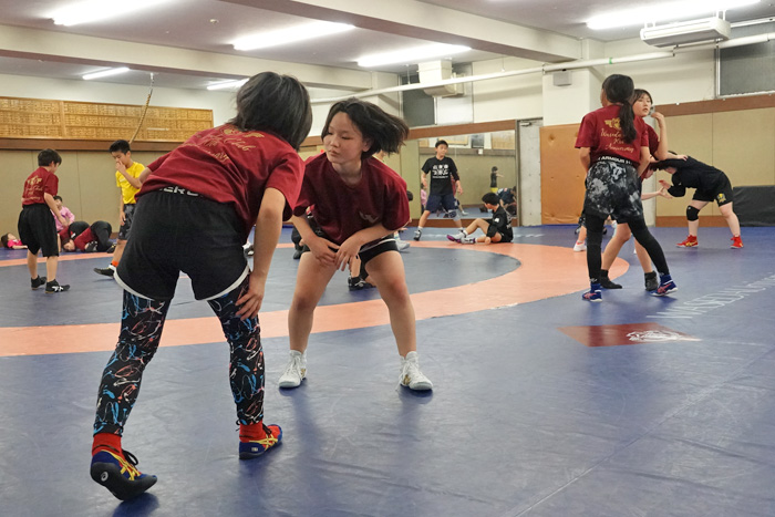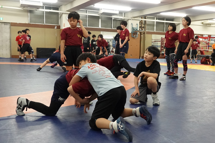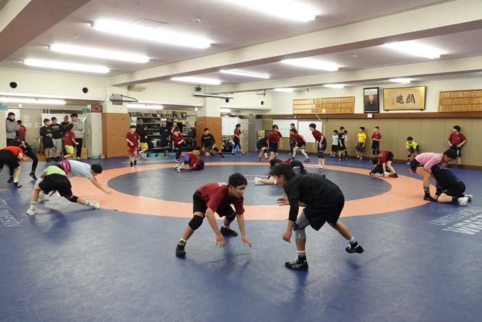 ▲通常のレスリング場に、半面分のマット’手前)を足しての練習