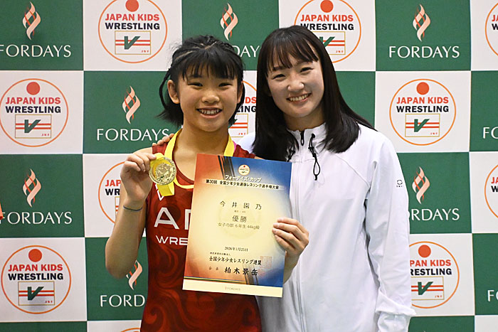 昨年の日本協会傘下連盟選出の年間最優秀選手に選ばれた今井園乃(その=ARC)が、女子6年44kg級で優勝して最優秀選手に選ばれた。兄の絢太(当時AACC)も2023年の傘下連盟選出の年間最優秀選手に選ばれたあと、この大会で優勝しており、兄妹での快挙を達成した。