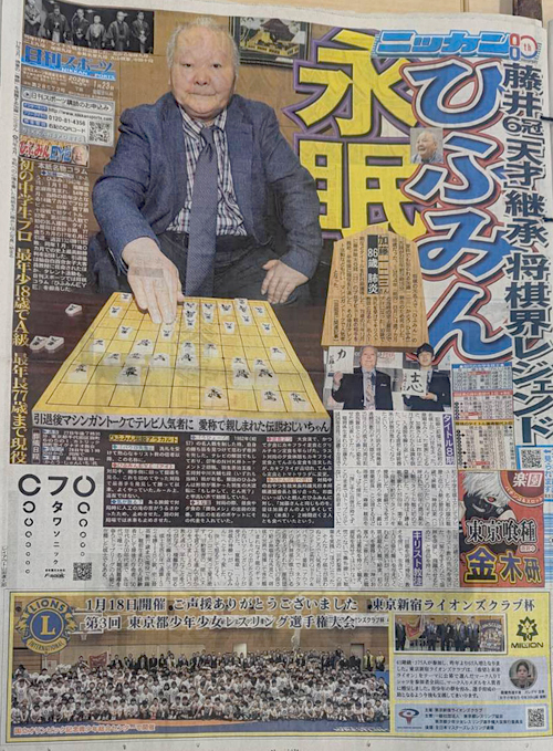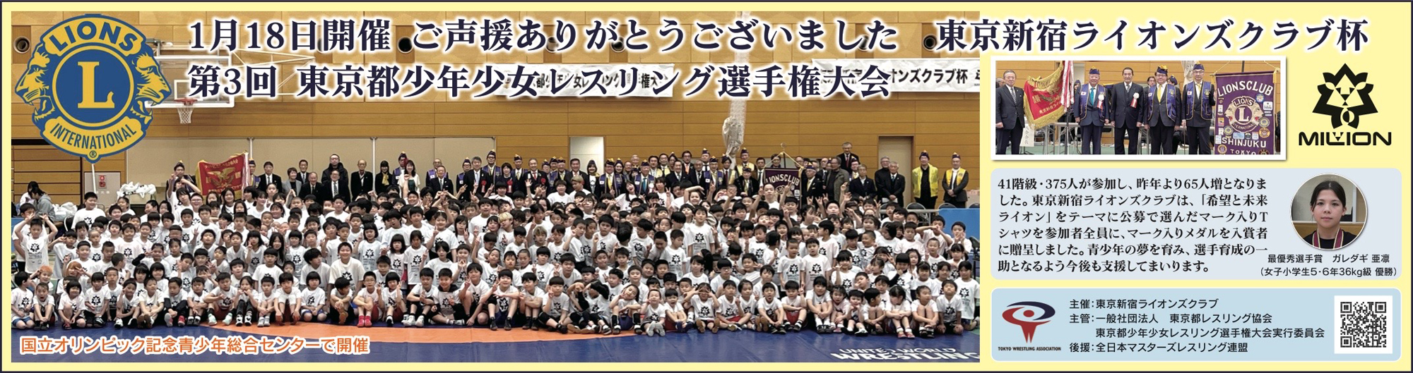 キッズ・レスリングがスポーツ新聞のトップ面へ! 1月18日に東京・青少年総合センターで行われた2026年ライオンズ杯東京都少年少女選手権(関連記事)の参加選手による全体写真ほかのレポートが、1月23日発行の日刊スポーツの1面に掲載された。