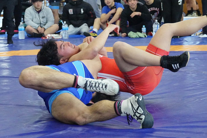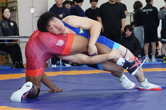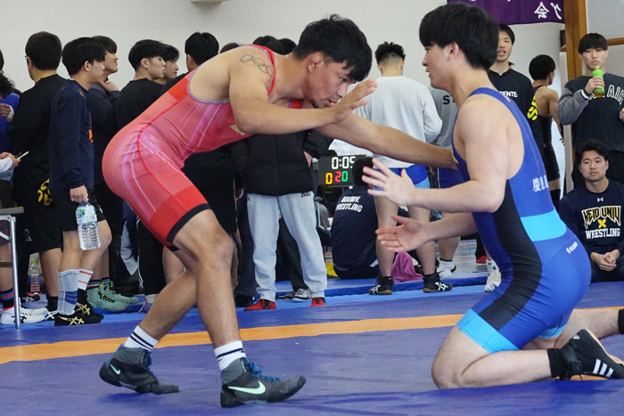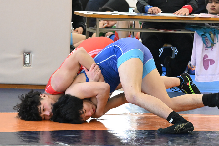 ▲第1試合:FS60kg級 岡虎樹(帝塚山大)○[14-6]●髙橋駿翠(青=九州共立大)