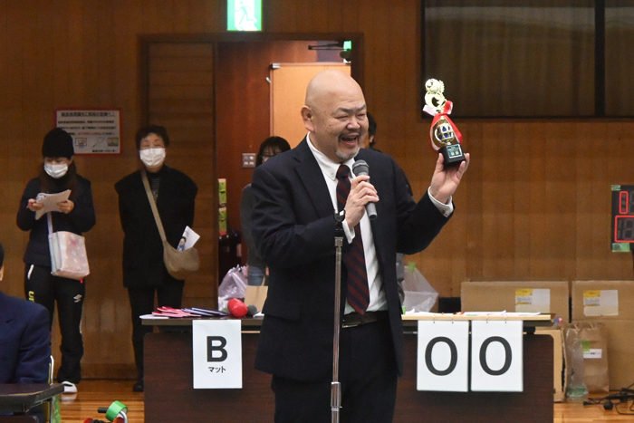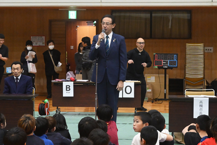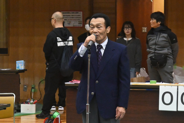 ▲高槻市レスリング連盟・河内義雄会長から、第40回を記念し、全優勝選手へトロフィーの贈呈が発表された