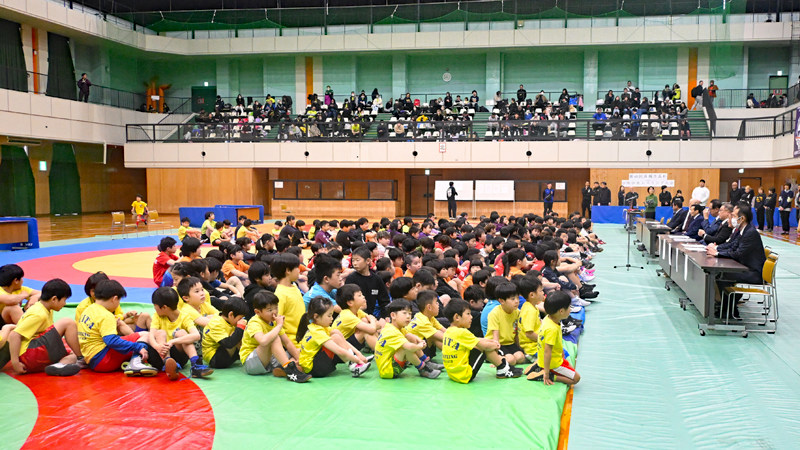 ▲高槻市レスリング連盟・河内義雄会長から、第40回を記念し、全優勝選手へトロフィーの贈呈が発表された