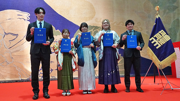 日体大の卒業式が2026年3月15日、東京・世田谷キャンパスで行われ、2024年パリ・オリンピック優勝の藤波朱理選手(レスター入社予定)と2025年世界選手権優勝の髙橋海大選手(ALSOK入社予定)が理事長賞を受賞。新たな世界へ飛び出した。