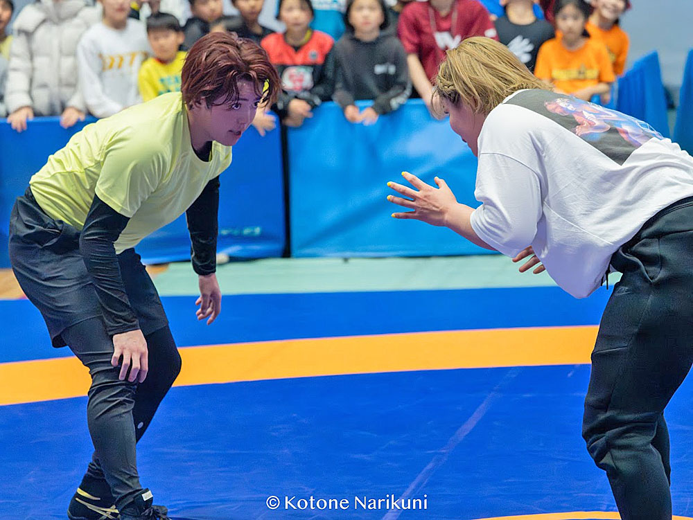 最終日には、鏡選手がテレビ番組で“闘った”アイドルグループ「Travis Japan」の吉澤閑也さんが来場。鏡選手との対戦を機にレスリングを始めたそうで、その成果を試すためスペシャルマッチを行った。生で見ることはそうないアイドルの登場に、会場はオープン前から長蛇の列。大会出場選手と一般来場者約700人が見守る中、鏡優翔選手が5-4で勝利。オリンピック金メダリストの強さを見せた。