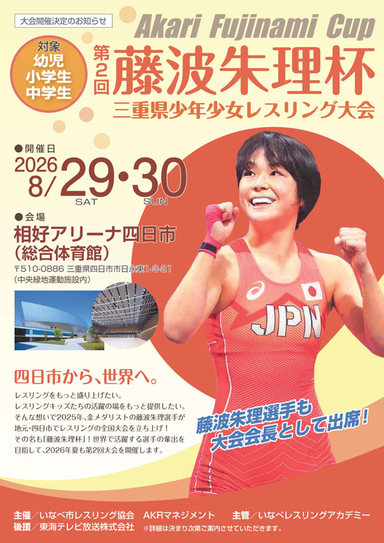 三重県のいなべ市レスリング協会は、2026年の第2回藤波朱理杯三重県少年少女レスリング大会を、8月29日(土)~30日(日)に三重県四日市市の相好アリーナ四日市(総合体育館)で開催することを発表した。