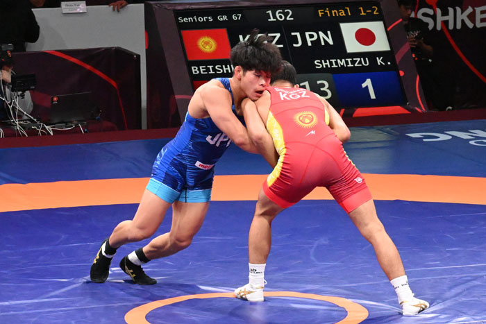 【ビシュケク(キルギス)】2026年アジア選手権第3日は4月8日、前日開始の男子グレコローマン5階級の敗者復活戦とファイナルが行われ、決勝へ進んだ67kg級の清水賢亮(自衛隊)は敗れて銀メダル。3位決定戦へ進んだ60kg級の塩谷優(自衛隊)は勝って銅メダルを獲得したが、72kg級の成國大志(筒井メディカルグループ)は敗れて5位に終わった。