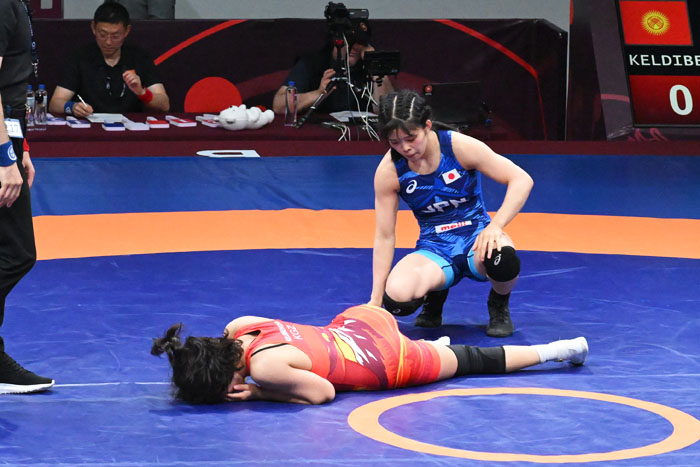 ■女子62kg級優勝・尾﨑野乃香(慶大OG=2023年アジア大会決勝で負けた北朝鮮に10-0でリベンジして優勝)「本当にうれしいです。この点差になるとは、正直言って思っていなかったです。ビッグポイントの4点を2度、取れたのが勝負にうまくつながりました。すごくいい試合でした。(4点先制して気持ちが楽になった?)そうは、まったく思っていなかったです。負けたときも大技を受けて負けました。4点を取っても、さらに2点、2点と取っていくつもりでした。セコンドからも『行こう!』という声が聞こえました。相手は焦っていると思ったので、攻撃を続けました。