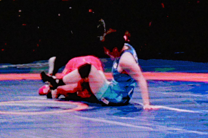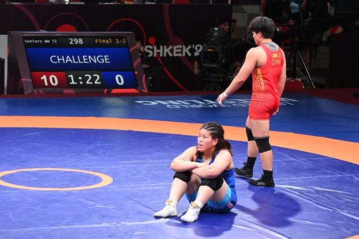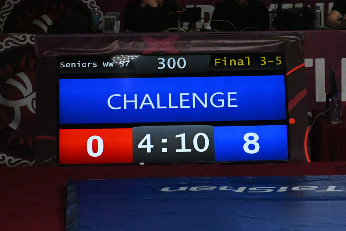 ■女子65kg級2位・池畑菜々(育英大=いったんは勝ったが、相手陣営のチャレンジで勝敗が変わる、下写真)「まだ現実として受け入れられないです。(自分の感覚としては?)必死だったので、覚えていないです。なんで脚を触られたのだろうか、と。ポイントは入ってないんじゃないかな、と喜んだんですけど…。(ロースコアの競り合いのときの気持ちは?)絶対に勝つ、という気持ちでした。点にはつながらなくても、何度か入りこめていたし、(レフェリーから相手に)何度かアクションの声がかかっていたし…。