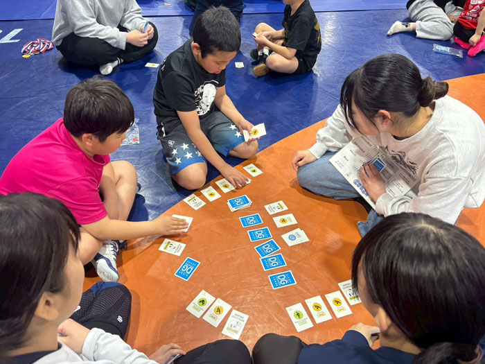 レスリング部の選手、スポーツファーマシスト、栄養科学科の学生や保護者が各グループに入り、子どもたちと一緒にゲームをプレーしながら交流した。このゲームでは、単に勝敗を競うだけでなく、薬やサプリメントをどのように選ぶか、迷ったときにどのように確認するかが重要なポイントとなる。