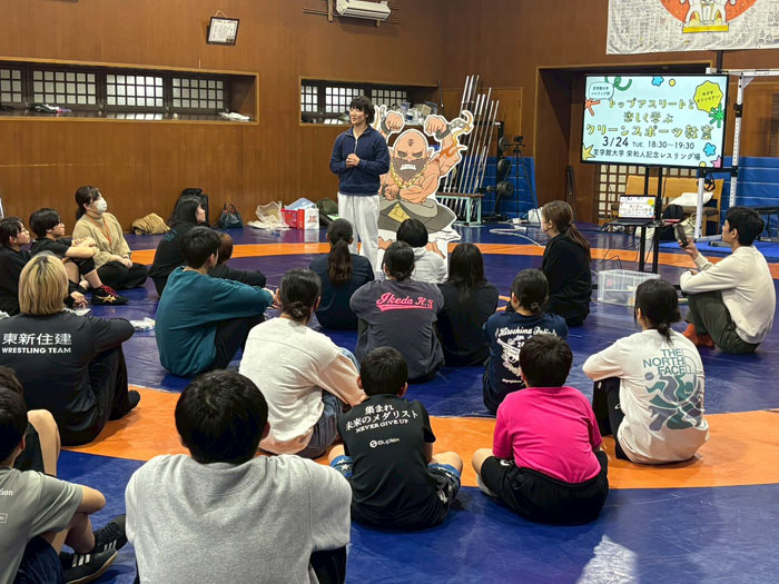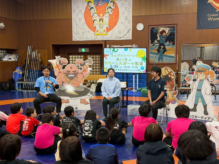 本年開催されるアジア・アジアパラ競技大会(愛知・名古屋市)を背景に、スポーツへの関心が高まる中、至学館大レスリング部は3月24日、同大学の栄和人記念レスリング場において、至学館レスリングクラブの小中学生およびその保護者を対象とした体験型イベント「トップアスリートと楽しく学ぶ クリーンスポーツ教室」を開催した。